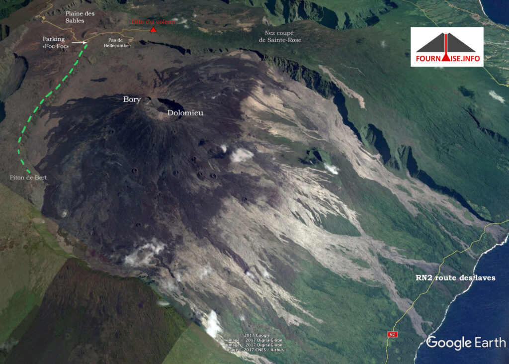 Depuis quelques années, les éruptions de la Fournaise débutent souvent à proximité du cratère Dolomieu, dans une zone voisine du flanc sud/sud-est du volcan, à proximité du Piton Morgabine. Le meilleur point de vue se situe donc au Piton de Bert. Pour vous éviter de tourner en rond, nous vous donnons les informations nécessaires pour rejoindre facilement ce point de vue.