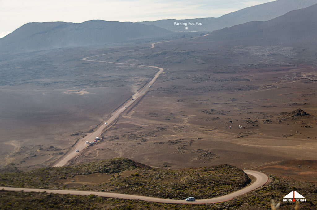 Ensuite, on traverse la Plaine des sables et après quelques minutes, vous verrez sur votre droite un très grand espace de parking en terre battue (le parking foc-foc) où vous pourrez garer votre véhicule; la randonnée démarre à cet endroit en partant sur votre droite.